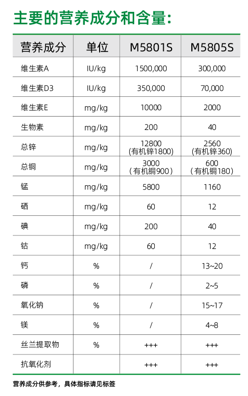 什么是微量元素,顾名思义,就是指需求量比较低的矿物质营养素,通常不能直接添加,需要提前混合后使用。健荷奶牛预混料中常用到的微量元素有铁、铜、锌、锰、碘、硒和钴。一般来讲都使用他们的无机形态即硫酸盐、硫酸亚铁、硫酸铜等。也有一些预混料中会添加一些有机微量,比如有机锌、有机硒。有机的要比无机的成本高许多。以健荷爱蹄宝M5801S、M5805S为例