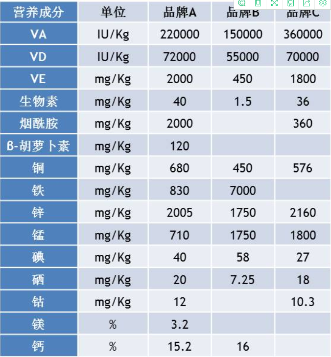 首先我们所说的预混料是指添加里维生素和微量元素的混合饲料。预混料添加量往往在0.1%-10%这个区域。加下来,我们挑出最常见的5%预混料为例,从营养成分的组成以及饲喂成本两方面来解说,